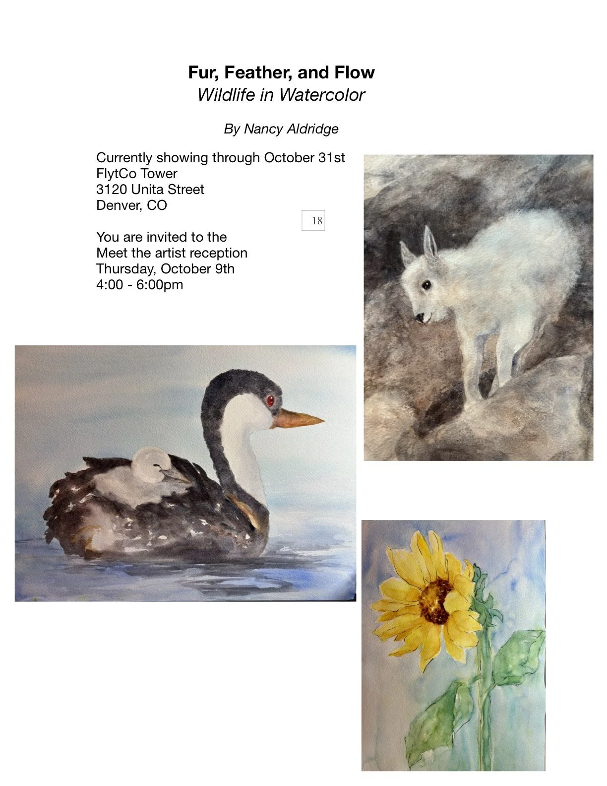 Back to All Events Meet The Artist Thursday, October 9, 2025 4:00 PM 6:00 PM FlyteCo Tower 3120 Uinta Street Denver, CO, 80238 United States (map) Google Calendar ICS Meet The Artist- Nancy Aldridge! Join Nancy on the 2nd floor in the Fireplace Room for a Happy Hour meet & greet and explore her Fun, Feather, and Flow Wildlife in Watercolor collection. Discover unique and beautiful pieces, all available for purchase.