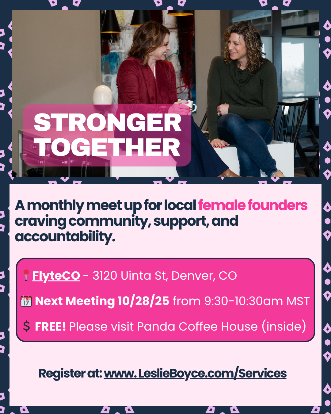 Looking for community? Don’t miss this free monthly meet up for local female founders to connect over coffee.